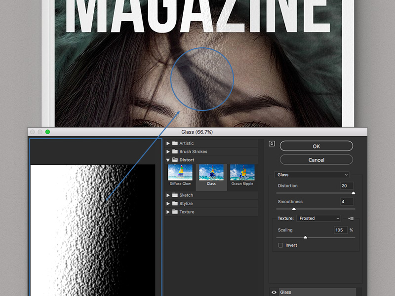 But the Glass and Ocean Ripple filters have an unconventional use which can come in very handy. If you draw a black to white gradient and apply one of these filters to it, you end up with a glossy effect which you can overlay on other graphics to give them the illusion of a reflective finish. Think magazine covers, vinyl stickers, reflective foil etc.