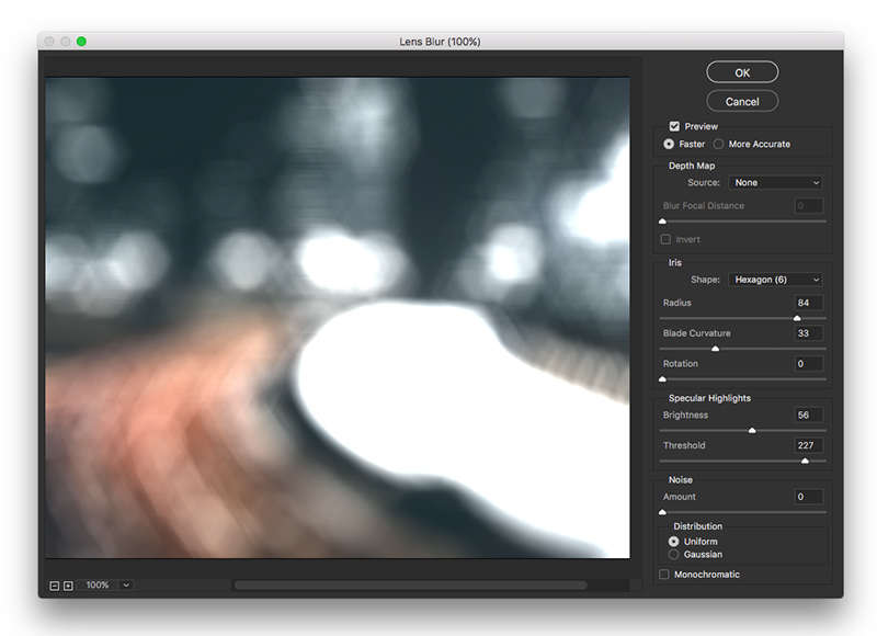 My favourite part of Lens Blur is the ability to create realistic looking Bokeh effects. Crank the Radius and Highlights sliders up high and then experiment with the Threshold slider to get the right amount of bokeh, it can create some really nice looking effects.